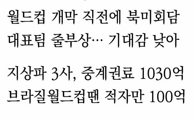 중계권료로 9500만 달러(약 1030억원)를 지출한 지상파 방송 3사로선 ‘적자 월드컵’을 면할 뾰족한 묘수가 없다. 이영표(KBS), 안정환(MBC), 박지성(SBS) 등 스타 선수 출신을 해설위원으로 내세워 월드컵 중계방송 홍보에 공을 들이는 이유다. 지상파 3사는 중계권료가 7500만 달러였던 2014년 브라질 월드컵 당시 100억원 이상의 적자를 낸 것으로 알려진 바 있다. 그나마 이번 월드컵에선 우리 대표팀의 경기가 주로 밤 9시~12시에 편성된다는 점이 희망적인 편이다. A사 마케팅 담당자는 “지난 브라질 월드컵 때 보다 경기시간대가 좀 더 좋기 때문에 광고효과는 더 좋을 것으로 예상한다”면서도 “다만 대표팀에 대한 기대치가 낮은 상황이라 낙관적으로만 보긴 힘들 것 같다”고 말했다.