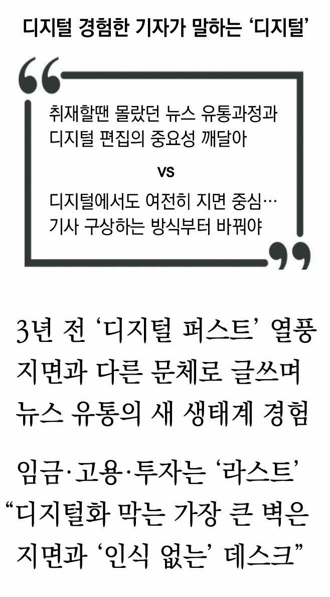 반면 디지털 전환을 가로막는 언론사 내부의 벽도 실감했다. 조회수에 목매면서 저품질 기사를 쏟아내고, 지원과 투자 없이 성과를 내야 하는 현실에 부딪혔다. 종합일간지 C 기자는 “트래픽을 의식할 수밖에 없어서 연성뉴스를 엄청나게 쓰게 된다. 그럴 때마다 회의감이 든다”며 “취재부서 때보다 수당이 크게 줄어 동기들과 임금 차이도 꽤 난다. 디지털부서는 공채 기자 몇 명을 제외하고 계약직으로 구성되는 경우가 많아 임금체계, 고용형태, 투자에선 디지털 퍼스트가 아니라 라스트”라고 꼬집었다. 디지털부서를 거친 언론사 중견 D 기자도 “언론계 디지털 시장은 뉴스 유통, 재밌는 영상으로 눈길 끄는 것 외에 창의적이고 새로운 걸 시도해볼 수 있는 환경이 아니다”라며 “지금처럼 디지털 지원과 투자가 지지부진하다면 경험자들은 다시 디지털로 가려고 하지 않을 것”이라고 말했다.