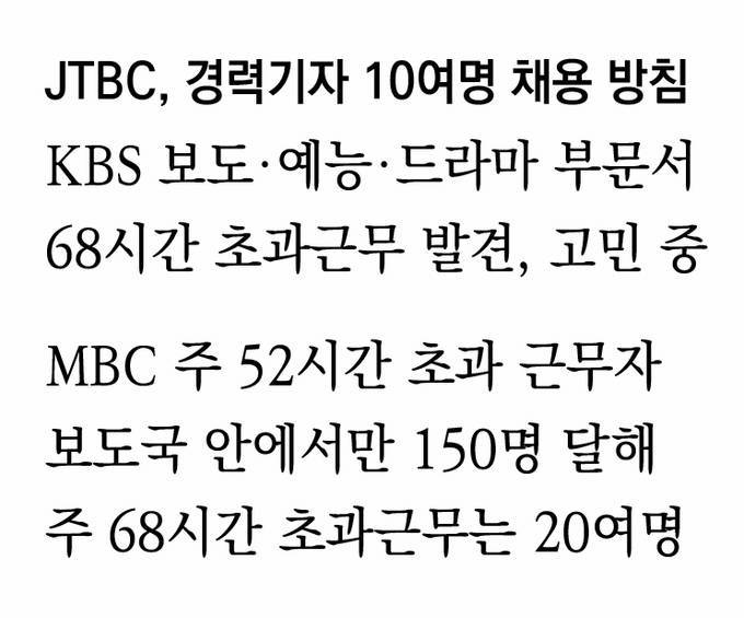이런 상황에서 JTBC는 우선 인력 충원부터 손을 댔다. JTBC 관계자는 “주 52시간과 관련해 실태조사를 한 후 취재기자를 증원하는 것이 필요하다고 판단해 경력기자 채용 쪽으로 방침을 세웠다”며 “조만간 절차에 들어갈 예정이다. 10명 안팎으로 충원할 계획”이라고 말했다.
