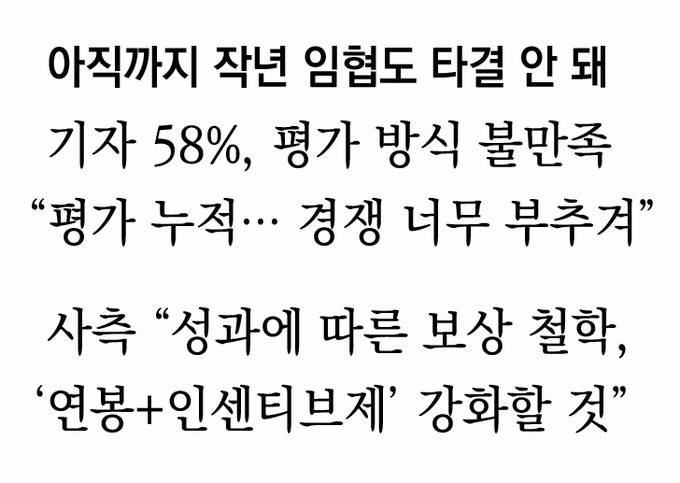 실제 노사가 임협을 벌이는 종합일간지 8곳을 살펴보면 인사평가가 임금에 가장 큰 영향을 미치는 곳은 중앙이다. 경향·한겨레·한국일보는 인사평가 결과를 임금에 반영하지 않고 조선일보와 국민일보는 연말 상여금에만 적용한다. 동아일보는 개인별 평가를 바탕으로 기본 인상률의 ±20% 내에서 차등을 둔다. 기본 인상률이 5%라면 실제 인상률은 4~6% 범위에서 결정돼 격차가 크지 않다. 서울신문에서도 인사평가 최상위등급(SS)과 보통등급(BB)의 차이가 1.5%포인트에 그친다.