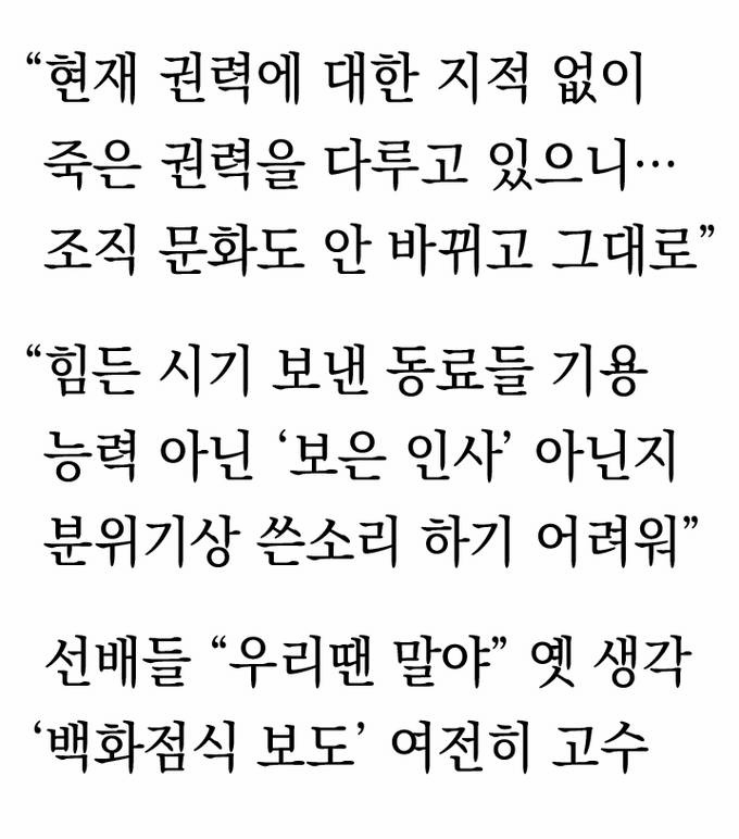 구태한 조직 체계도 혁신의 걸림돌로 지목된다. 업무 능력과 전문성, 희망 부서 등을 기준으로 인사 개편을 해야 하는데, ‘옛 정’에 이끌려 적재적소의 인사가 제대로 이뤄지지 않고 있다는 지적이다. C기자는 “지난 정권에서 배제됐다 몇 년 만에 돌아온 동료에게 쓴 소리를 하기가 어려운 분위기”라며 “힘든 시기를 보낸 동료에게 자리를 내주다보니 능력위주의 인사가 아닌 ‘보은 인사’가 돼 조직이 제대로 굴러가지 않고 있다”고 했다.