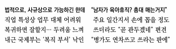 “법적으로 다 사용이 가능한 건데도 스스로 불편한거죠. 기자라는 직업 특성상 바쁜데 대체할 사람이 없는 걸 누구보다 잘 알고 있기 때문에, 미안한 마음도 있고 복귀하면 다시 적응해서 잘할 수 있을지 두려움도 있고요.” (일간지 기자)