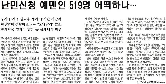 지난 12일엔 한라일보에서도 출도 제한 명령으로 제주 체류가 불가피한 예멘인들이 입국 한 달 만에 생활비를 모두 소진해 생계난을 겪고 있다는 기사를 보도했다. 예멘인들을 바라보던 불안한 시선은 “예민 난민 껴안는 취업 조치는 바람직” “국제사회 일원으로서 당연한 의무” 등으로 완화됐다.