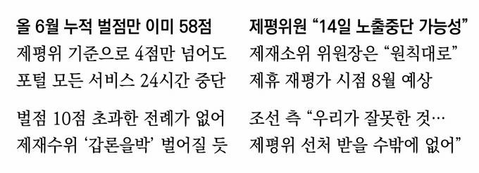 제휴평가위 한 위원은 “점진적으로 벌점이 올라간다는 가정 하에 제재 규정을 설계한 것인데 벌점이 한꺼번에 부과될 경우 그 벌점에 해당하는 제재만 할지, 아니면 가중 처벌을 할지 고민이 있을 수 있다”며 “다만 지난달에 한 번에 8점 이상의 벌점을 받은 사례가 올라온 적이 있는데 그 경우엔 개선의 기회를 안 줬다는 점에서 가중 처벌은 하지 않고 벌점 구간에 해당하는 서비스 48시간 노출 중단과 재평가 제재를 의결했다. 조선일보가 만약 58점 벌점을 받았다면 14일 노출 중단과 재평가 제재가 의결될 것으로 보인다”고 말했다.
