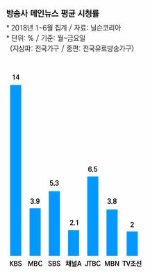 올해 상반기 지상파 방송사 3사와 종합편성채널 4사의 메인뉴스 평균 시청률이 감소 추세인 것으로 나타났다. 평창 동계올림픽이 열린 2월과 미투 폭로, 남북·북미 관계 개선 보도로 3월에 잠깐 상승했던 시청률이 4월부터 내리막길을 걸은 것이다.