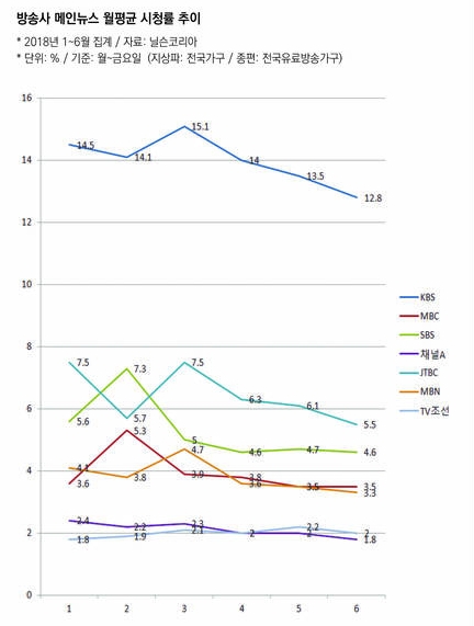 기자협회보가 닐슨코리아 자료(지상파는 전국가구, 종편은 전국유료방송가구 기준)를 토대로 지난 1월부터 6월까지 월~금 평일 방송사 메인뉴스 시청률을 집계한 결과 지상파 방송사의 평균 시청률은 1월 대비 6월에 0.9%p, 종편은 0.8%p 하락했다. 방송사별로는 ‘JTBC 뉴스룸’이 1월 평균 7.5%에서 6월 평균 5.5%로 가장 크게 하락했고 ‘KBS 뉴스9’도 1월 14.5%에서 6월 12.8%로 1.7%p 하락한 것으로 나타났다. 전체적인 경향을 보면 MBC와 SBS는 2월 이후, KBS와 JTBC, MBN, 채널A는 3월 이후 평균 시청률이 꾸준히 하락했다.