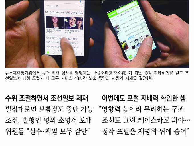 이목이 집중됐던 조선일보에 대한 제재는 48시간 포털 노출 중단과 재평가로 일단락됐다. 중징계와 봐주기라는 시각이 공존하는 이면에 포털의 막강한 지배력이 새삼 확인됐다는 평가가 나온다. 뉴스제휴평가위라는 외피를 입은 포털이 조선일보를 제재함으로써 포털에서 헤어날 수 없는 언론 현실이 적나라하게 드러났기 때문이다.