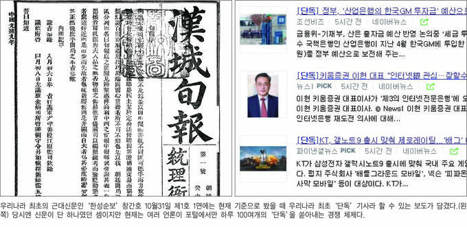 1883년 우리나라 최초의 근대신문인 ‘한성순보(漢城旬報)’가 창간된다. 국립중앙도서관 대한민국 신문 아카이브를 보면 그해 10월31일 발행된 제1호 1면에는 ‘창간사’인 ‘순보서(旬報序)’를 포함해 총 세 꼭지가 담겼는데 여기 우리나라 최초의 단독인 인사 기사가 있다. 기사는 “8월6일 유지를 받들어 호군(護軍) (관직의) 윤우선을 강원 관찰사에 임명한 것을 삼가 기록한다”고 적고 있다.