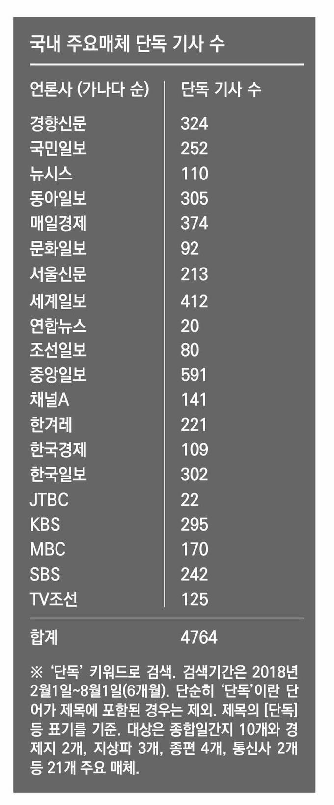 이 기간 가장 많은 단독기사를 내놓은 언론사는 중앙일보(591개)로 전체 단독기사 중 12.4%에 해당했다. 세계일보가 412건으로 2위(8.64%)였고, 매일경제가 374건(7.9%)으로 3위를 차지했다. 이어 MBN(364건·7.64%)과 경향(324건·6.8%), 동아(305건·6.4%)의 순이었다. 가장 적은 단독기사를 낸 언론사는 연합(20건·0.42%)과 JTBC(22건·0.46%)였다. 연합은 통신사라는 점이 영향을 미친 것으로 보인다. JTBC는 지난 2월 말부터 단독 표기를 하지 않으면서 2월 중 나온 기사만 카운트됐다.