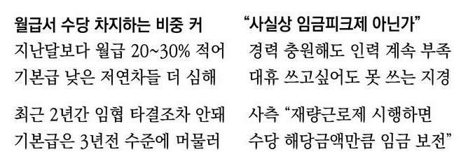 노조에 따르면 특히 기본급이 낮은 저연차 기자들의 월급에서 수당이 차지하는 비중은 30~35%에 이른다. 더 이상 수당을 받지 못하는 상황에서 임금협상도 2년째(2017~2018년) 체결되지 않아 기본급마저 오르지 않고 있다. 2016년 입사자부터 올해 들어온 신입까지, 1~3년차가 같은 임금을 받고 있다.