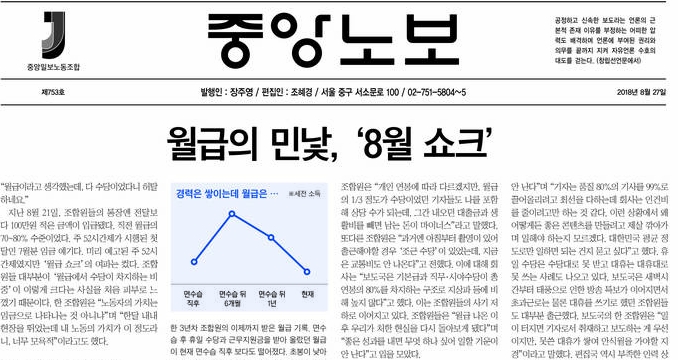 얇아진 월급봉투와 함께 2년치 임협 미체결이 맞물리면서 기자들의 불만이 커지고 있다. 중앙 노사는 기본급 인상폭을 두고 팽팽하게 맞서고 있다. ‘2017년+2018년’ 기본급에 대해 노조는 6% 인상, 사측은 4.75% 인상을 제시했지만 당장 이견을 좁히긴 어려워 보인다.