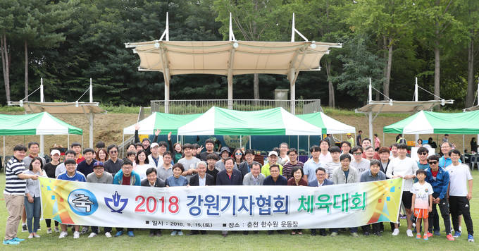 강원기자협회는 지난 15일 춘천 신북읍 한국수력원자력본부 운동장에서 ‘2018 강원기자협회 체육대회’를 개최했다. 강원일보, 강원도민일보, 연합뉴스, KBS, MBC, G1강원민방, 강원CBS 등 강원도 내 7개 회원사와 12개 지회 소속 기자, 가족 200여명이 참석해 화합을 다졌다. 족구와 단체줄넘기, 이어달리기, 축구, 발야구, 농구(자유투) 등 종목을 두고 열띤 경쟁을 벌인 끝에 종합우승은 강원일보에 돌아갔다. 준우승은 G1강원민방이 차지했다. 이상학 강원기자협회장은 “지난해 동계올림픽 성공 유치를 기원하며 강릉에서 체육대회를 개최했는데 올해는 평화와 통일의 관문으로서 강원도가 주목받는 가운데 행사를 열게 됐다”며 “외부 지원없이 진행된 이번 대회가 쭉 현장을 누빈 기자들에게 하루만이라도 업무 스트레스를 벗고 울타리의 존재를 느끼는 시간이었길 바란다”고 했다. 강원기자협회 제공