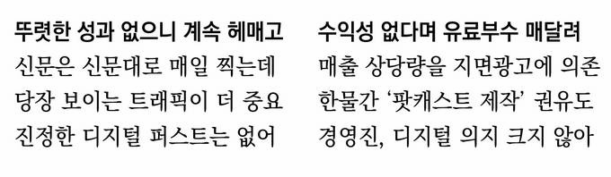 기자들은 아직 안정적인 디지털 수익모델을 찾지 못한 데다 매출 상당수가 지면광고로 이뤄지는 상황에서, 사실상 경영진이나 편집국 간부들의 디지털 퍼스트 실행 의지가 크지 않다고 입을 모았다. C 기자는 “디지털로 가야하고 혁신해야 한다지만, 현실적으로 디지털 퍼스트를 한다고 해서 독자들의 긍정적인 피드백이나 언론사들이 체감할 만한 수익성을 기대하기 어렵지 않느냐”며 “경영진·편집국 고참들 입장에선 디지털이 우리 먹거리가 된다는 확신을 주지 못하는 상황”이라고 말했다.