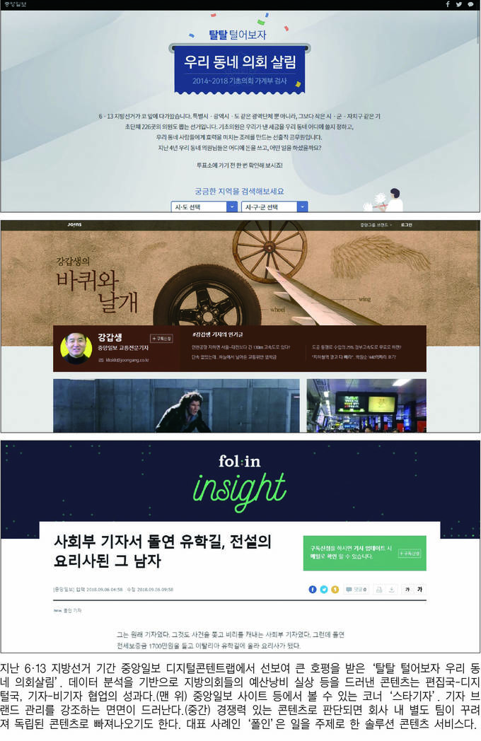 중앙일보는 어떻게 디지털 전환을 하고 있을까. 최근 몇 년 간 언론계에서 가장 궁금해 해 온 질문 중 하나다. 일부 콘텐츠에 대한 호평이나 숫자로 드러나는 뉴스유통 부문 선전은 일면에 불과하다. 중앙일보가 디지털 혁신을 추진하면서 가장 크게 달라진 점은 각 부서·구성원 간 유기적으로 맞물리는 협업 체계 구축이다. 협력이 디지털에 적합한 콘텐츠 발굴로 이어지고 구성원의 디지털 마인드를 고양시키는 과정이 되는 협력의 선순환 구조야말로 중앙이 이룬 성과다.