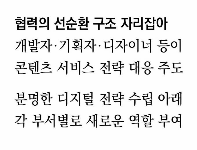 모든 언론사가 같은 방식을 취할 필요는 없겠지만 분명한 디지털 전략수립 아래 부서 간 새로운 역할을 부여하고 유기적인 커뮤니케이션 방식을 마련하는 게 필수적일 것으로 보인다. 디지털에 특화된 뉴스 제작시스템(CMS), 자체 데이터 분석툴(JA) 등 인프라 구축이란 바탕에 수차례 조직개편을 거치고도 현재 수준의 디지털마인드가 조직 내 공유되는 데는 몇 년이 걸렸다.