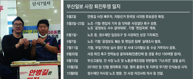 이 가운데 안 사장이 선거에 개입하지 않겠다는 약속을 어기고 ‘부산일보 사장’ 직함을 사용한 배우자 지지 문자 메시지를 발송한 사실이 드러나며 논란이 되기도 했다. 회사 주최 수익행사를 통해 확보한 명단을 이용, 수백 건의 문자를 보냈다는 의혹까지 번졌다. 언론노조 위원장이 배석한 임·단협 거부 등으로 부당노동행위 고발도 당했다. 경찰은 ‘문자 불법 선거운동’에 대해 선거법 위반 혐의로, 부산고용노동청은 임단협 거부 등에 대해 노동조합 및 노조관계법 위반으로 검찰에 송치했다. 지난 1일 임·단협 쟁의 투표 가결, 출정식과 지부장 단식투쟁을 거쳐 현재까지의 과정이다.