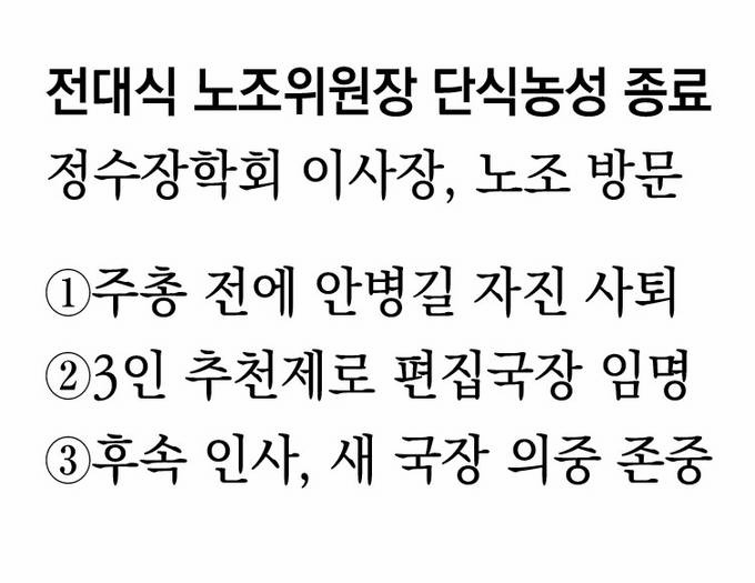 이번 사태는 지난 4일 정수장학회 측에서 이사장이 노조를 직접 방문, 사태 해결을 위한 대화에 나서겠다는 뜻을 전하며 급물살을 탔다. 앞서 쟁의찬반투표에서 82.4%라는 압도적인 내부 지지가 확인되고 지부는 5일 재단 항의방문을 할 예정이었다. 그간 소유와 선임구조 등을 두고 꾸준히 말이 나왔던 만큼 재단 측도 현 국면에 심히 부담을 느꼈을 것이란 시선이 많다. 재단 이사장이 직접 지부를 찾아 사태 해결에 나선 건 그만큼 이례적이다.