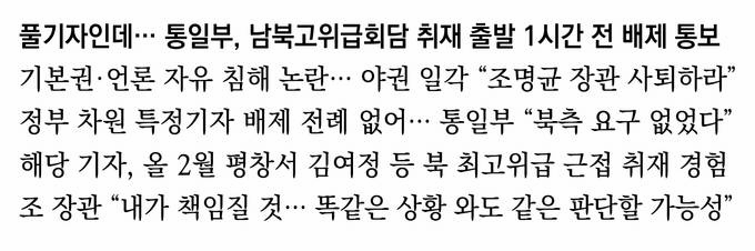 통일부는 지난 15일 판문점 우리 지역 평화의집에서 열린 남북고위급회담의 공동 취재를 위해 구성된 풀취재단에서 김명성 조선일보 기자를 일방적으로 배제했다. 통일부는 이날 회담 장소로 떠나기 약 1시간 전 김 기자와 통일부 기자단 간사에게 전화를 걸어 “조선일보에서 풀 기자를 다른 기자로 바꾸지 않으면 김 기자를 공동취재단에서 제외한다”고 통보했다.