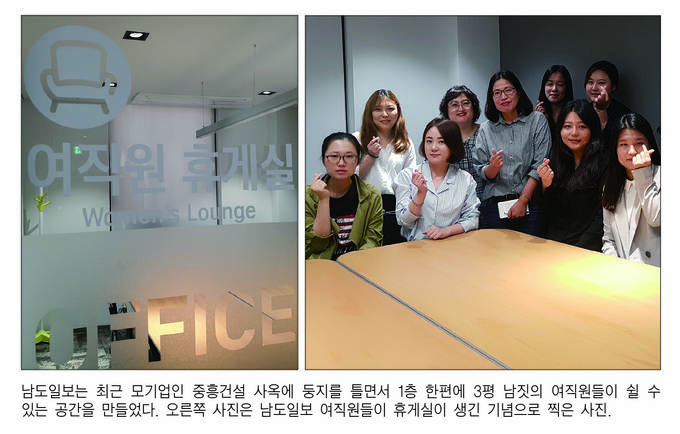 남도일보가 사옥을 이전하며 여직원 휴게실을 마련했다. 남도일보는 최근 모기업인 중흥건설 사옥에 둥지를 틀면서 1층 한편에 3평 남짓의 여직원들이 쉴 수 있는 공간을 만들었다.