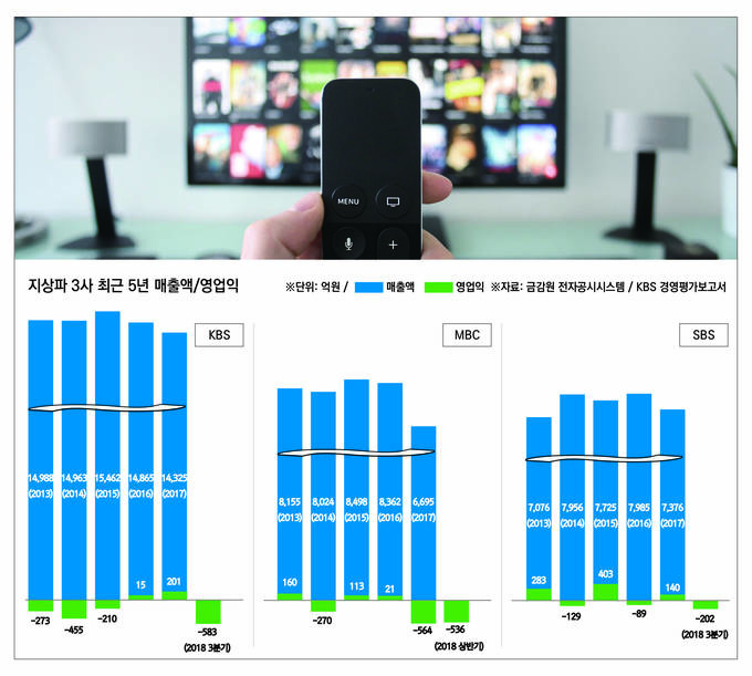이 때문일까. 지난해 지상파의 매출액은 KBS의 경우 2016년에 비해 540억원, SBS는 609억원 줄어들었고, MBC는 그 규모가 더욱 커 1667억원 감소하는 수치를 보였다. 영업이익률도 최근 5년간 2%를 채 넘기지 못했다. SBS가 2015년 5.2%의 영업이익률을 낸 걸 빼면 2014년 이후 지상파 3사 모두 높아야 1%대의 영업이익률을 기록했다. 그에 비해 영업손실 폭은 늘어 MBC는 지난해 8%대의 영업손실률을 나타내기도 했다.