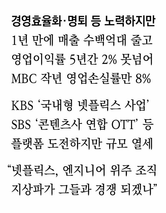 지상파 방송사 3사가 ‘창사 이래 가장 심각한 위기’를 맞고 있다. 미디어 환경이 급변하면서 방송이 인터넷으로 확장되고 모바일에서는 스트리밍 시청형태가 보편화되며 지상파의 영향력이 뚜렷하게 줄고 있어서다. 변화한 시청 행태에 미처 대비하지 못한 지상파들은 CJ 같은 콘텐츠 대기업, 넷플릭스 등 글로벌 온라인 동영상 서비스(OTT)들이 강자로 군림하고 있는 모바일에서 무한 경쟁에 내몰리게 됐다. 무거운 몸집, 상대적으로 많은 규제, 비효율적인 조직문화라는 악조건은 덤이다.