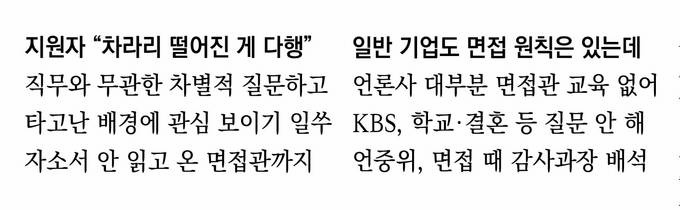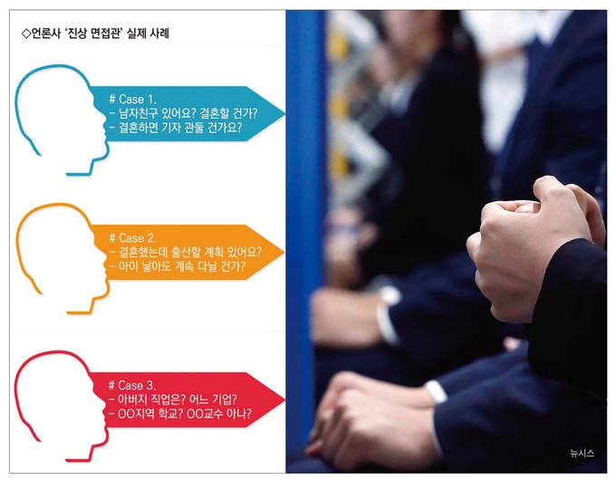 언론사 채용 면접에서 직무 수행과 무관한 차별적 질문을 하는 사례가 잇따르고 있다. 언론사에서 면접을 본 이들은 임신·출산 계획이나 결혼여부를 묻는 성차별뿐만 아니라 가족의 학력과 직업을 묻는 사회적 신분 차별, 출신학교명을 묻는 학력 차별 질문이 여전히 존재한다고 전했다. 현행 고용정책기본법 제7조는 취업 기회의 균등한 보장을 위해 성별, 사회적 신분, 학력, 출신학교, 혼인·임신 등을 이유로 구직자를 차별하면 안 된다고 규정하고 있지만 언론사 면접에선 이들 모두 쉽게 무시됐다고도 했다.
