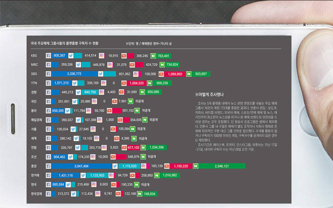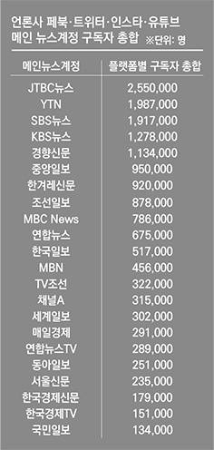 본보가 주요 매체들의 페이스북, 트위터, 인스타그램, 유튜브(지난 1월17일~21일 조사) 플랫폼 내 뉴스 콘텐츠 관련 계정과 네이버 구독자수(지난 28일 오전 기준)를 조사해 합산한 결과 중앙 계열의 디지털 구독자수가 가장 많은 것으로 나타났다. 중앙일보와 JTBC라는, 신문과 방송 영역 각각에서 ‘톱3’ 안에 드는 브랜드 파워가 합산되며 이런 결과가 나왔다. 종합편성채널을 갖고 있거나 따로 방송 매체를 운영 중인 신문사들은 한국ABC협회 유가부수 순위 등과는 달리 디지털 영역에선 상대적으로 적은 수치를 보이며 구독자 규모에 차이를 드러냈다.