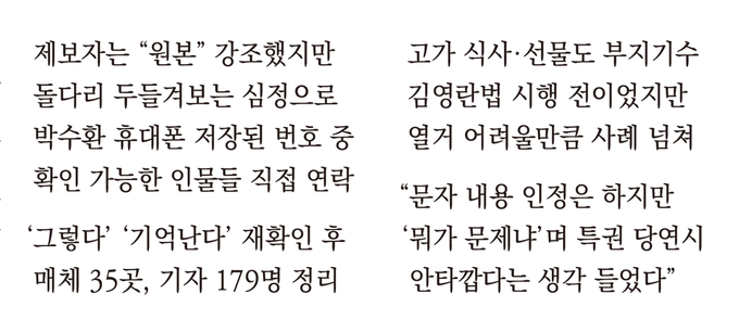 기자 4명과 PD 2명이 달라붙어 3만 건에 가까운 문자 내용을 분석하고, 여기에 데이터팀까지 가세했다. 언론사 이름이 없거나 번호만 저장된 경우는 구글링을 거쳐 35개 언론사, 기자 179명의 명단을 정리했다. 단순히 문자를 주고받거나 식사만 함께 한 경우도 있었지만, 고가의 식사 접대나 선물을 받은 기자들도 “일일이 열거하기 힘들 정도”로 많았다. 비록 김영란법(청탁금지법) 시행 이전이었지만 결코 권장할 일은 아니었다.
