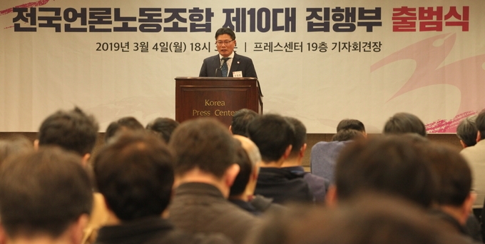 전국언론노동조합 10대 집행부가 4일 출범했다. 이날 서울 중구 세종대로 프레스센터 19층 기자회견장에서 열린 출범식에서 오정훈 위원장과 송현준 수석부위원장은 ‘새롭게 소통하는 언론, 행동하는 언론노조’를 강조했다. 오정훈 위원장은 취임사에서 “지금 미디어 환경은 격변의 시기를 보내고 있다”며 “10대 집행부는 이 새로운 도전에 맞서 언론 본연의 임무와 공공성을 어떻게 실천할지 고민하고 해결방안을 마련할 것”이라고 말했다.