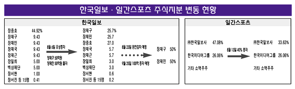 지난 6일 완료된 증자에서 장재구 회장은 동생인 장재민 미주한국일보 회장과 함께 각각 약 50억원씩을 출자하면서 총 51.4%를 확보, 과반수의 지분을 차지했다. 최대주주였던 장중호 일간스포츠 사장은 당초 알려진 것과는 달리 증자에 불참했다.