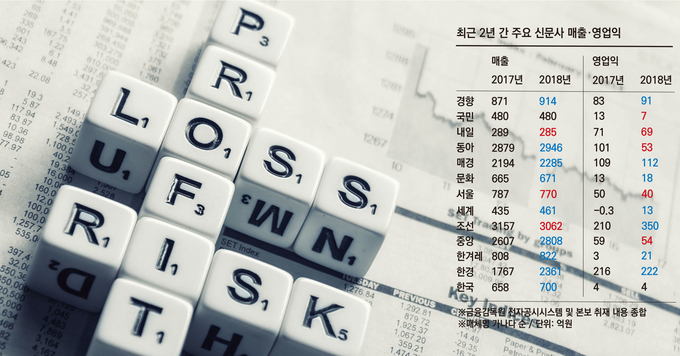 각 사별로 보면 조선일보의 매출 감소폭이 가장 컸다. 조선은 2017년 3157억원에서 2018년 3062억원으로 95억원이 줄어들어 3000억원 선을 힘겹게 유지했다. 다만 2017년 거의 절반 가까이 줄었던 영업이익은 140억원 늘어난 350억원대로 회복세를 보였다. 서울신문은 3년 연속 매출 하락에 영업이익, 당기순이익 모두 전년보다 줄었다.