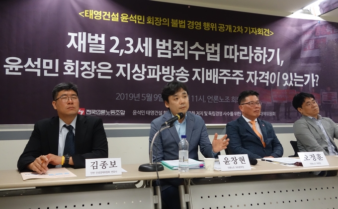 비대위원장인 윤창현 전국언론노조 SBS본부장은 "합병을 통해 지분율을 물타기해 법망을 무력화시켰다. 이들에게 공정거래법은 뜀틀이었다"며 "합병 후 본격적으로 SBS 일감을 싹쓸이하면서 윤 회장은 엄청난 불로소득을 챙겼다"고 주장했다.