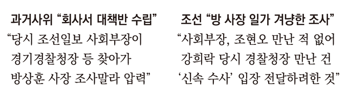 조선은 이동한 당시 사회부장이 조현오 경기청장을 찾아가 압력을 행사했다는 과거사위 발표에 대해 “(둘이) 만난 사실 자체가 없다”고 반박했고, 강희락 당시 경찰청장을 만난 것은 ‘신속 수사’ 입장을 전달하기 위한 것뿐이었다고 해명했다. “사건과 아무 관련 없는 조선일보 방 사장에 대한 근거 없는 허위 사실이 일부 언론을 통해 확산하면서 방 사장과 조선일보 구성원에 대한 심각한 명예훼손이 발생했기 때문”이라는 것이다.
