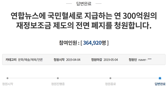 청와대는 청원 마감 한 달 만인 3일 공식 답변을 내놨다. 이날 정혜승 청와대 디지털소통센터장은 "연합뉴스에 대한 재정보조는 2003년 4월30일 국회가 제정한 '뉴스통신진흥에 관한 법률'에 따라 집행되고 있다"면서 "연합뉴스사는 국가기간통신사로서 공적 기능을 수행해왔으며, 이에 대한 지원 차원에서 정부구독료 계약이 이뤄지고 있다"고 전했다.