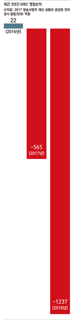 MBC는 올해 경영 목표를 이뤄도 3년 연속 적자를 맞는다. 지난 1월 MBC는 대주주인 방송문화진흥회에 매출 7440억원, 영업비용 7835억원 등을 골자로 -395억원대 적자예산 편성을 보고했다. MBC는 지난해 1237억원, 2017년 565억원 영업손실을 거둔 바 있다. 3년 간 누적적자만 2200억원에 달할 수 있다. 중소신문사 몇 개를 매매할 수 있는 규모의 손해다. 상장회사라면 4년 연속 적자 시 관리종목에 들어가고 5년 연속 시 상장폐지가 된다. 지난 10년 내 MBC가 3연속 영업손실을 낸 적은 없었다.