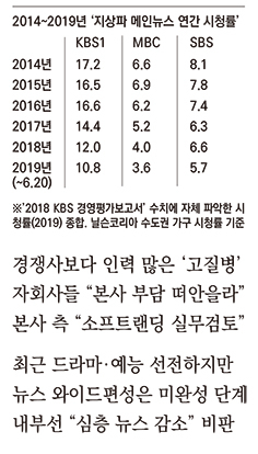 방송사의 신뢰 자산을 책임질 뉴스 역시 아직은 안착했다고 하기 어렵다. MBC는 지난 3월18일 ‘더 빨리 더 오래’ 시청자를 만나겠다는 취지로 메인뉴스를 개편했다. 오후 7시30분 시작해 100여분간 진행되는 와이드편성이다. 기자협회보 조사결과(닐슨코리아 수도권 가구시청률) MBC <뉴스데스크>는 와이드편성 전후 0.2%p의 평균시청률 상승을 보였다. 올해 1월1일부터 3월17일까지 3.6%시청률이었지만 3월18일부터 6월20일까진 3.8%였다. 동기간 KBS<뉴스9>는 11.2%에서 10.4%로, SBS<8뉴스>는 5.8%에서 5.7%로 미세한 감소세를 보였다.