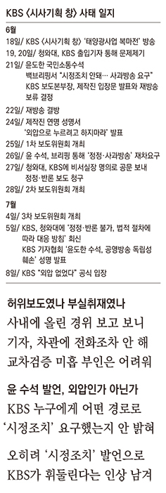 이번 사태에서 청와대의 부적절한 대응이 ‘외압’ 논란을 초래했다는 지적도 잇따르고 있다. 윤도한 국민소통수석은 지난달 21일 백브리핑을 통해 “KBS 보도에 대해 즉각 시정조치를 요구했으나 사흘이 지나도록 아무런 답변이 없다”고 말했다. KBS 누구에게 어떤 경로로 ‘시정조치’를 요구했는지는 밝히지 않았다. 그리고 다음날 예정됐던 재방송이 취소되면서 ‘외압’ 의혹이 불거졌다. 논란이 커지자 윤 수석은 지난달 26일 브리핑에서 “정상적인 절차를 거쳐서 정정 보도를 요구했다”고 말했다. 윤 수석은 그 ‘절차’에 대해 역시 함구했지만, KBS에 따르면 국민소통수석실 관계자들이 KBS 청와대 출입기자에게 “해당 프로그램의 일부 내용이 잘못됐다, 정정보도를 신청할 것”이라는 취지의 언급을 한 것이 전부였다고 한다. 보도에 대한 반론이나 정정을 요청할 때 먼저 출입기자를 통하는 것이 윤 수석이 말한 대로 “관례”이긴 하지만, ‘정상적인 절차’라는 데는 이견이 있을 수 있고, 그것이 ‘공식적’이라고 보기는 더더욱 힘들다. 청와대는 논란이 커질 대로 커진 뒤에야 대통령 비서실장 명의로 KBS에 공문을 보내 정정·반론 보도를 청구했다.