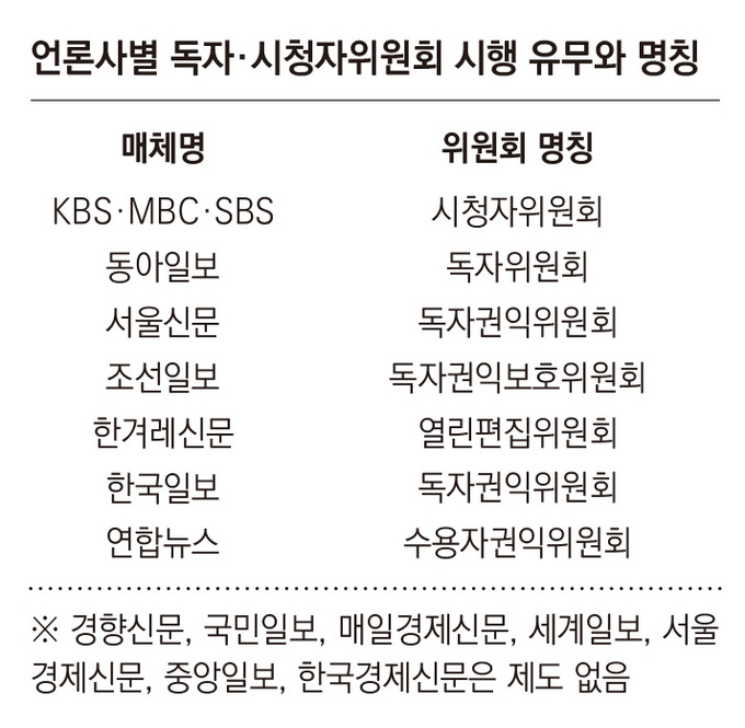 지상파 방송사 3사와 연합뉴스는 각각 방송법, 뉴스통신진흥법에 의거해 시청자위원회, 수용자권익위원회를 두고 있다. 반면 신문법은 ‘독자의 권익을 보호하기 위한 자문기구로 독자권익위원회를 둘 수 있다’고만 규정하고 있어 신문사의 위원회 운영은 의무가 아니다. 실제 주요 조간 종합일간지와 경제지 등 12개 신문 가운데 5곳(동아일보, 서울신문, 조선일보, 한겨레, 한국일보)만 독자권익위원회를 운영하고 있다. 경향신문, 국민일보, 세계일보, 중앙일보, 매일경제신문, 서울경제신문, 한국경제신문에는 관련 제도가 없다.