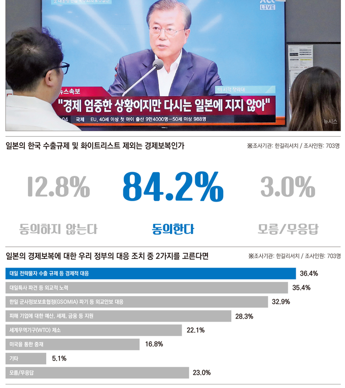 일본의 경제보복에 맞선 우리 정부의 대응 조치 2가지를 고르라는 질문에 대일 전략물자 수출규제 등 경제적 대응이 36.4%로 가장 높게 나타났다. 다음으로 대일특사 파견 등 외교적 노력(35.4%), 한일 군사정보보호협정 파기 등 외교안보 대응(32.9%), 피해 기업에 대한 예산·세제·금융 등 지원(28.3%), 세계무역기구(WTO) 제소(22.1%), 미국을 통한 중재(16.8%) 등의 순이었다.