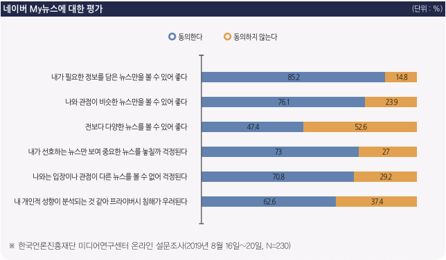 응답자 중 이용자 맞춤형 뉴스인 MY뉴스를 이용한 비율은 24%에 불과했다. 네이버 에어스 알고리즘에 대한 평가를 물은 결과, MY뉴스를 이용한다고 한 응답자 중 75.8%가 ‘내가 필요한 정보를 담은 뉴스만을 볼 수 있어서 좋다’고 했지만, ‘내가 선호하는 뉴스만 보여 중요한 뉴스를 놓칠까 걱정된다’도 73%가 응답해 알고리즘 뉴스 배열에 대한 양가적인 생각이 있는 것으로 나타났다. 뉴스 배열 신뢰도에서는 인공지능 알고리즘을 선택한 비율이 70%로, 전문적인 사람(30%)보다 높았다.