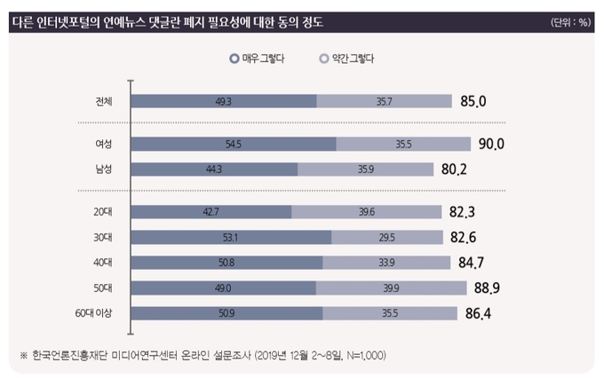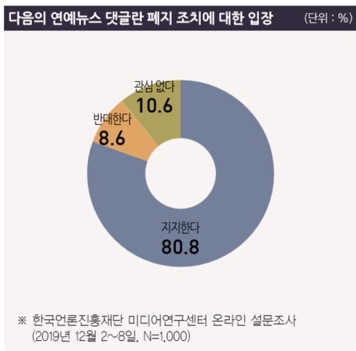 한국언론진흥재단 미디어연구센터가 성인남녀 1000명을 대상으로 지난 12월2~8일 온라인 설문조사를 실시한 결과(미디어이슈 5권 6호 '댓글폐지, 실검 폐지에 대한 국민 인식', 양정애 언론재단 선임연구위원) 응답자 80.8%는 포털 다음의 연예뉴스 댓글란 폐지 조치를 ‘지지한다’는 입장을 밝힌 것으로 나타났다. 반면 폐지 반대 의견은 8.6%에 불과했다. 특히 여성 응답자 중 댓글 폐지 조치를 지지한다고 밝힌 비율은 88.2%에 달해 90%에 육박하는 수준이었다. 남성 응답자는 이에 비해 14.5%p 적은 73.7%가 폐지에 지지 의사를 드러냈다.