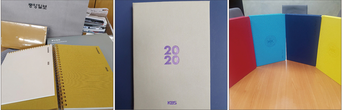 MBC는 올리브색, 파란색으로 두 가지 버전의 다이어리를 내놨다. 예년 다이어리는 겉표지가 종이라 불편했지만, 가죽으로 바뀌어서 훨씬 좋아졌다는 평이다. KBS<가운데> 수첩은 베이지색 바탕 표지 위에 보라색 ‘2020’ 글씨 디자인으로 새롭게 탄생했다. 중앙일보<왼쪽>는 다이어리를 포함해 탁상 달력, 취재수첩, 보조배터리, 무선충전 겸용 마우스패드 등을 세트로 제공했다.