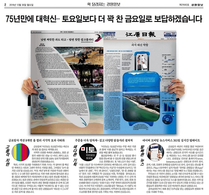 강원일보는 이에 따라 오는 1월3일자부터 지면 개편을 단행하고 본격적인 주 5일 발행체제를 실행한다. 매주 24면 발행되던 금요일자를 8면 늘려 32면으로 증면하고, 늘어난 지면엔 주말 레저, 축제 가이드, 생활정보, 이색 인물 등 다양한 섹션과 심층 기획을 선보인다. ‘미리보는 토요일(미토)’이란 제목이 붙은 해당 주말섹션 8개 면은 올 컬러로 제작되고, “지역의 다양한 축제와 관광명소, 자연, 레저스포츠 등의 현장 분위기를 100% 살려 독자들에게 생생하게 전달”하게 된다. 편집 역시 사진과 그래픽을 중심으로 이뤄지고, 섹션 1~3면엔 지면 하단 광고 역시 배제한다는 방침이다.