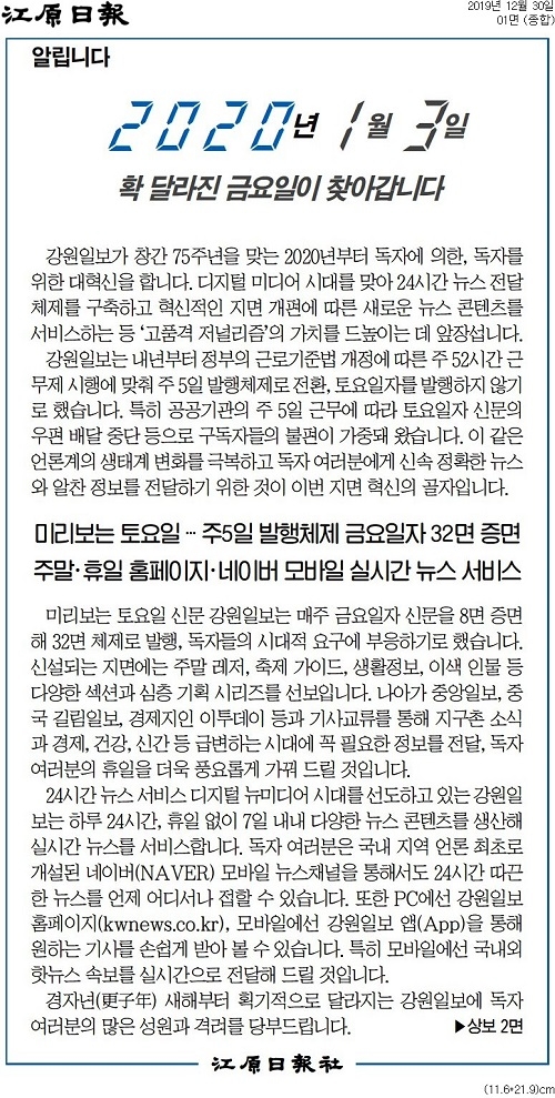 강원일보는 30일자 1, 2면 사고를 통해 이 같이 밝히고 관련한 지면 개편 내용 등을 전했다. 강원일보는 사고에서 “내년부터 정부의 근로기준법 개정에 따른 주 52시간 근무제 시행에 맞춰 주 5일 발행체제로 전환, 토요일자를 발행하지 않기로 했다”면서 “특히 공공기관의 주 5일 근무에 따라 토요일자 신문의 우편 배달 중단 등으로 구독자들의 불편이 가중돼 왔다”고 설명했다.