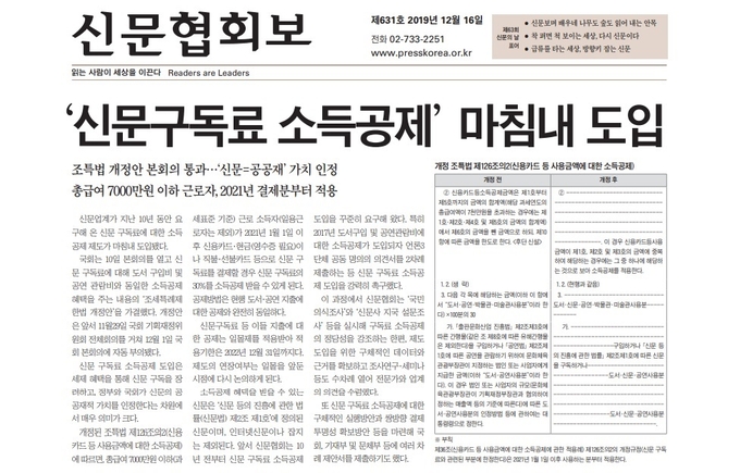 신문 구독료에 대한 소득공제 제도가 도입돼 2021년부터 2년 간 시행된다.