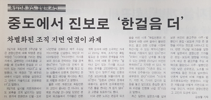 기자협회보 2001년 4월7일자는 독립언론 3주년을 맞은 경향신문 내부의 고민을 전했다. 앞서 경향신문은 1998년 4월 한화그룹이 보유한 주식 전부를 우리사주조합이 양도받아 그룹에서 분리, 독립언론을 기치로 새 출발했다. 신문의 논조도 중도에서 진보로 한 걸음 이동했다.