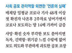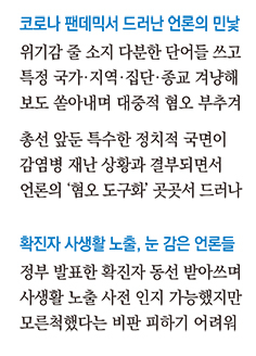 언론에 대한 기대에 반해 오히려 공포를 조장하거나 양산하는 기사 제목이 나오기도 했다. 2월18일 31번째 환자 발생 이후 대구·경북에서 코로나19 환자가 무더기로 나왔던 2월20일 당시 종합일간지 1면 톱 기사 제목은 <하루 22명 감염...코로나 둑이 터졌다>(조선), <신천지교회서 14명 ‘슈퍼전파’...대구 패닉>(동아), <하루 새 22명 확진...지역 방역망 무너졌다>(세계), <하루에만 22명...지역사회 집단감염 닥쳤다>(한겨레), <대구發 ‘2차 쇼크’...하루 새 확진 20명 쏟아졌다>(한국) 등이었다. ‘터졌다’ ‘패닉’ ‘무너졌다’ ‘닥쳤다’ ‘쇼크’ 등 위기감을 조장할 소지가 큰 단어를 사용한 것이다.