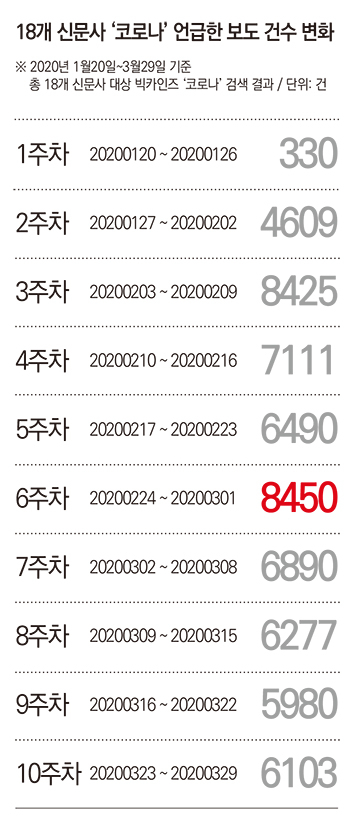 한국언론진흥재단의 뉴스 빅데이터 분석시스템 ‘빅카인즈’(BIG KINDS)를 통해 ‘코로나’가 언급된 기사 건수를 분석해보니 10주간 총 6만665개에 달했다. 매체당 하루 평균 48개 이상 꼴이다. 국내에서 첫 확진자가 발생한 1월20일부터 26일까지(1주차)에서 2주차로 넘어가며 보도 양이 14배 가까이 증가했다. 지역사회 전파이면서 신천지 교인의 확진판정이란 이슈성을 가졌던 2월18일 대구 확진자 발생 이후인 6주차(2월24일~3월1일) 때 보도 건수는 정점을 찍고 서서히 하강세를 보이고 있다. 서울 구로구 콜센터, 미국 유학생 확진자의 국내 유입 후 발생 등 뉴스가 있었지만 이전 보도 양을 능가하진 못했다.