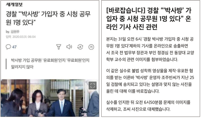 지난달 31일 새벽 6시쯤에 올라온 세계일보의 온라인 기사 <경찰 “‘박사방’ 가입자 중 시청 공무원 1명 있다”>에는 조국 전 법무부 장관과 정경심 동양대 교수의 사진<왼쪽>이 함께 실려 있었다. 마치 사진 속 두 사람이 이른바 ‘n번방 사건’과 관련이 있다고 오해를 불러일으킬 수 있는 심각한 오보였다.