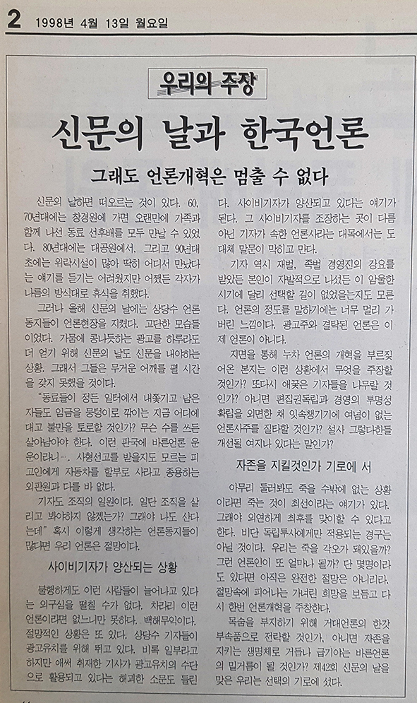 지난 1998년 신문의 날, 기자협회보는 언론 개혁을 이야기했다. 그해 4월13일자 기자협회보는 <신문의 날과 한국언론 - 그래도 언론개혁은 멈출 수 없다>라는 ‘우리의 주장’(사설)에서 언론인들에게 자존감을 지켜달라고 당부했다.